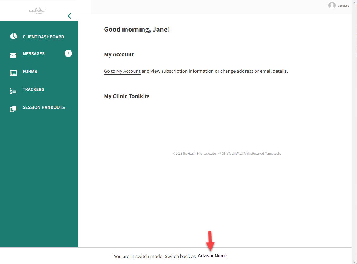 To return to your own Advisor account, simply click your name at the bottom of the screen:
