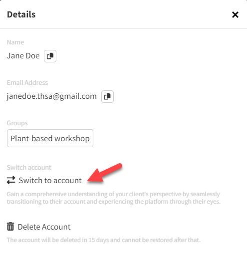 A pop-up will appear with the client name, email address, and groups that they are in.