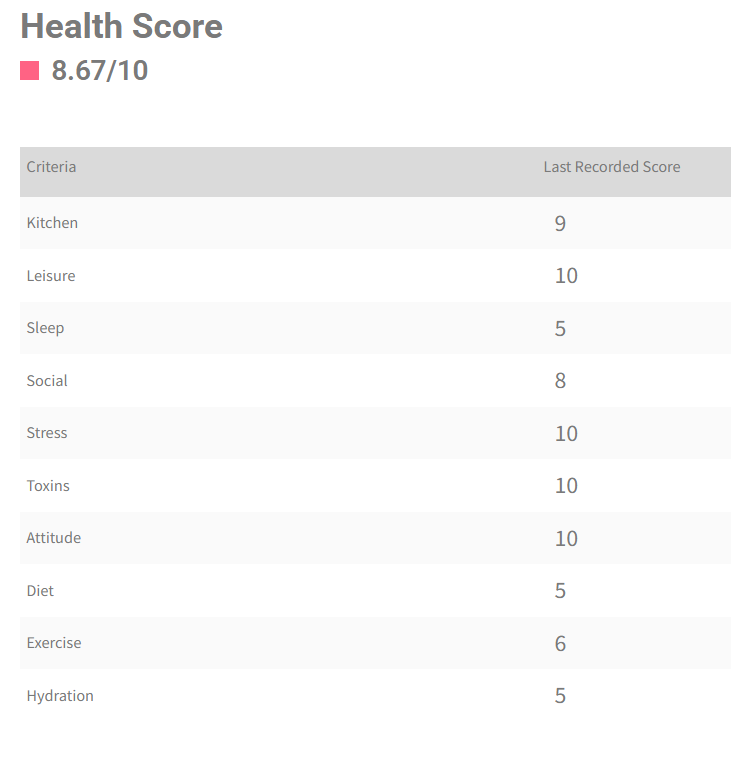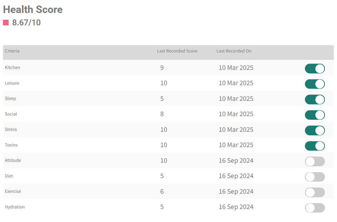 The Client Dashboard control contains the health metrics you want to track for a client. It has the following criteria: kitchen, leisure, sleep, social, stress, toxins, attitude, diet, exercise and hydration.