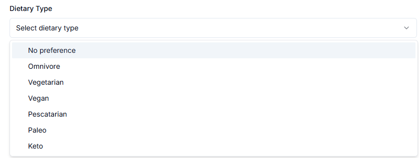 In the dietary type, you may select No preference, Omnivore, Vegetarian, Vegan, Pescatarian, Paleo, Keto