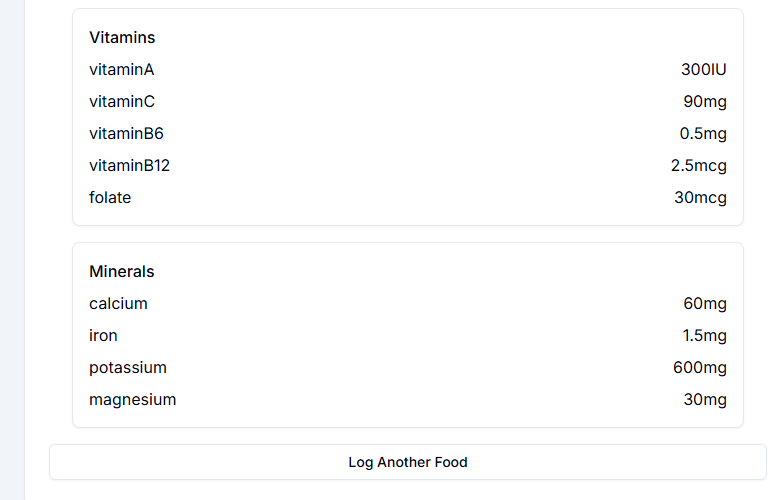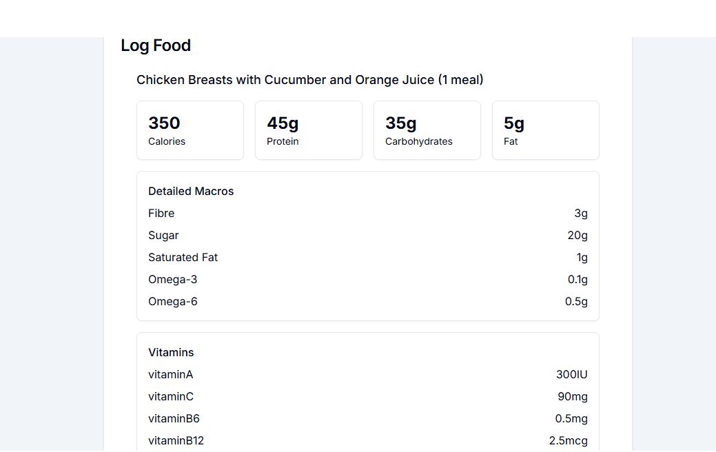 The AI will assess each entry to provide a breakdown of estimated calories, carbohydrates, protein, fat, vitamins