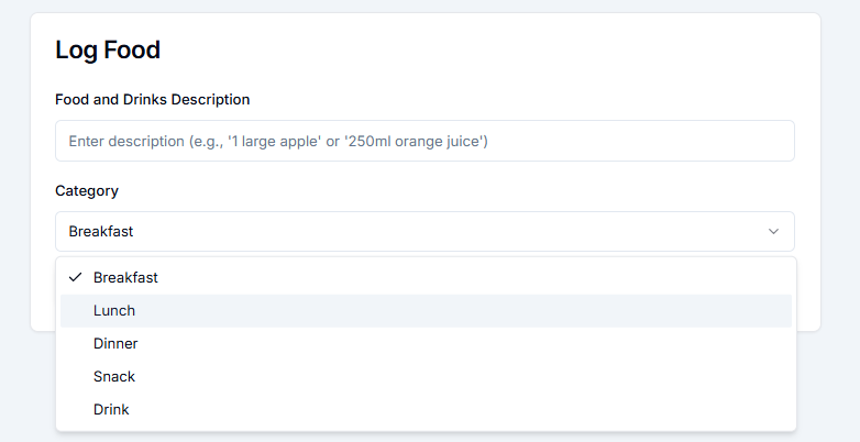 Select the category such as Breakfast, Lunch, Dinner, Snacks, or Drink