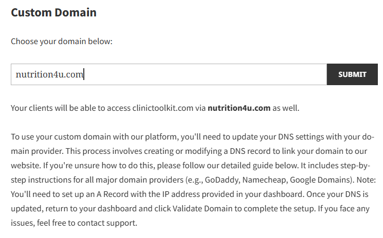 Second step: Go to the Clinic Toolkit Custom Domain page here: https://clinictoolkit.com/custom-domain/