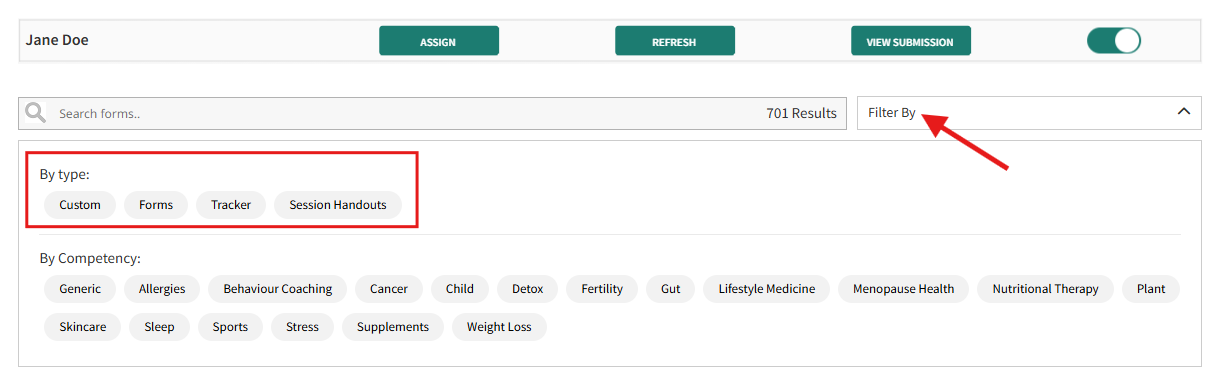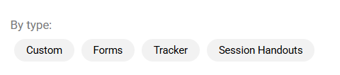 You can easily identify and manage Session Handouts with your dashboard. Use the filter feature to sort materials by type ( Custom, Forms, Trackers, and Session Handouts).