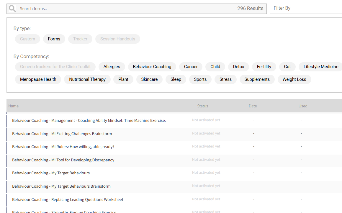 The Clinic Toolkit provides three primary material types designed to streamline client interaction and progress monitoring: Forms, Trackers and Session Handouts. There is an inclusion of a Custom type for professionals who would like to customise forms, trackers and session handouts.