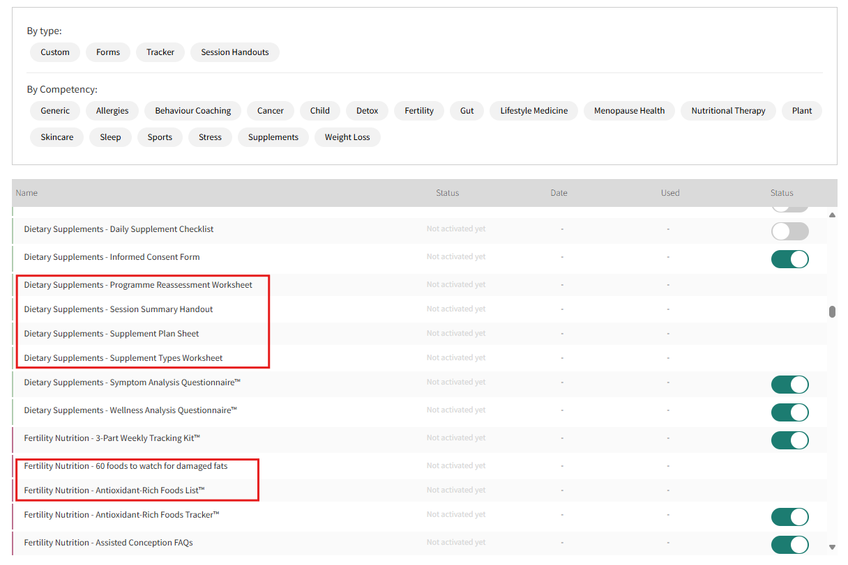 Additionally, session handouts are distinguishable by the absence of the toggle button used to assign Forms and Trackers to clients. The materials highlighted in the boxes in the image below are examples of Session Handouts.